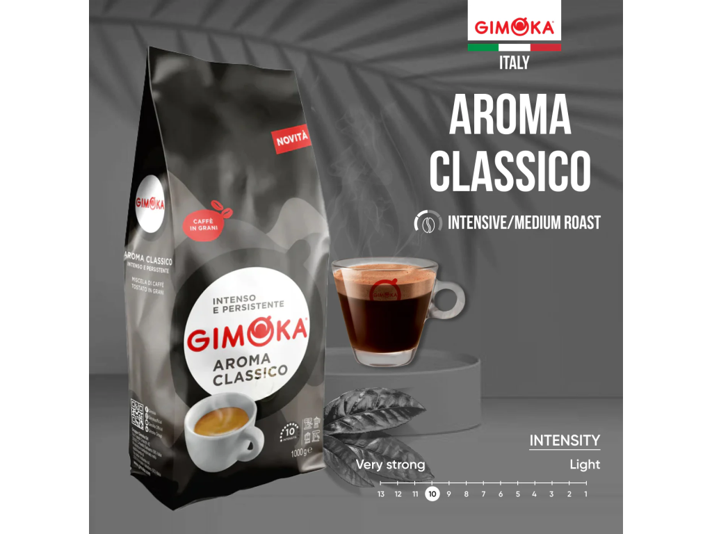 Popis: Gimoka Aroma Classico je vrcholná zmes značky Gimoka, pražená tak, aby ponúkala horko-sladkú chuť s plným telom a hustou cremou. Vysoký podiel arabiky zaručuje jemnejší charakter, zatiaľ čo robusta dodáva káve potrebnú silu a povzbudzujúci efekt.